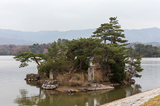 満濃池は人が造ったもので、水をためているダムです。大きさは日本最大級で、手を広げたような形の池の貯水量は、オリンピックプールの6,160杯分に相当する15,400,000m3。周囲は約20㎞、水深約22m、灌漑面積3000haになります。今から1,200年前に弘法大師空海が考案し、今も使われている仕組みに、水の圧力を分散させるアーチ型の堤と水位0が一定以上とならないよう、余分な水を下流に放流する余水吐きがあります。